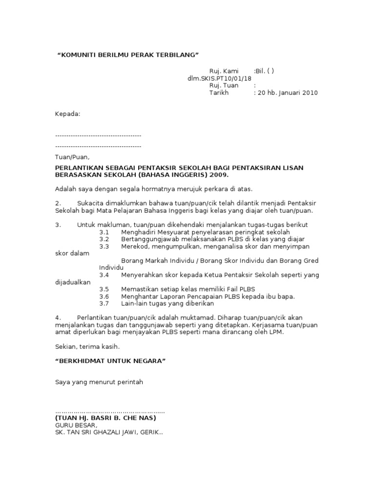 Contoh Surat Rasmi Memangku Tugas. Sekiranya anda menyebut lebih daripada satu kejadian, bahagikannya kepada 2 perenggan berbeza dan akhiri perenggan dengan kualiti yang perlu diserlahkan dengan setiap contoh. Jika anda pernah diminta untuk menulis surat rujukan watak, anda tahu kebimbangan yang boleh dibuat oleh permintaan itu. Perkara pertama yang terlintas di fikiran ialah "Bagaimana dalam dunia anda akan menulis satu?" Pemikiran ini diikuti dengan cepat oleh soalan seperti "Apa yang saya katakan?" dan "bagaimana jika saya mengatakan perkara yang salah dan membuat orang itu kelihatan buruk?"