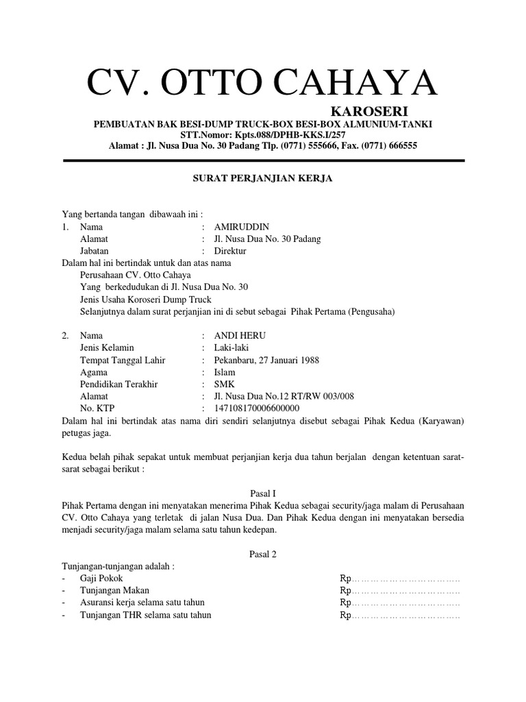 Contoh Surat Perjanjian Kerja